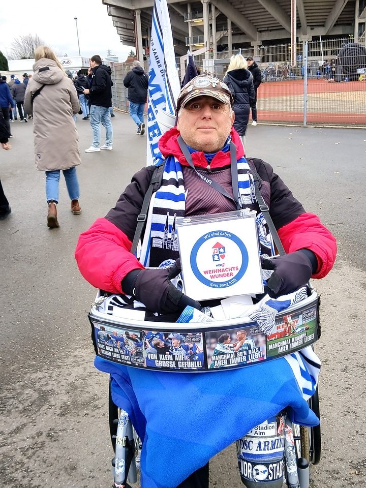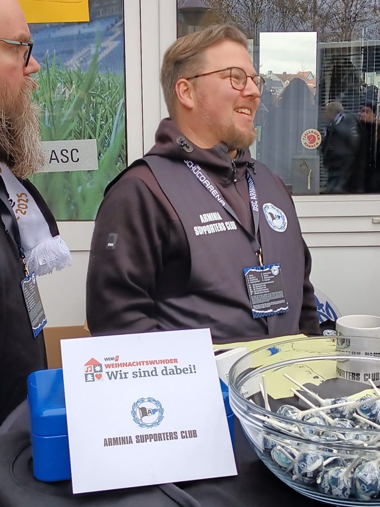 „Wir haben das jedes Jahr mit großem Interesse verfolgt“, sagt Brigitte Kamp vom Pavillon- Team des Arminia Supporters Club, „und so sind wir auf die Idee gekommen, uns ebenfalls zu beteiligen.“. Also schritt der ASC zur Tat – die gesamte Hinrunde hindurch sammelten wir Spenden für das Weihnachtswunder. Bei den Heimspielen stellten wir Spendenboxen am ASC-Pavillon auf und sammelten rund um die Tribünen des Stadions. Auf unseren Busfahrten zu Auswärtsspielen ließen wir die „Klimperkisten“ herumgehen. Unser Fanmobil beteiligte sich ebenfalls an der Spendenwerbung und auch Jörg Fischer, der im Rahmen seiner Aktion „Ich mache – Du spendest – Wir helfen“ schon viele Spenden sammelte, steuerte zur Sammelaktion bei.
